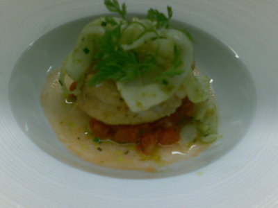 Mientras va congelando la sepia prepararemos el tomate concassé. Se debe escaldar el tomate, pelarlo y vaciarlo de pepitas a conciencia. Seguidamente se debe cortar en dados (corte concassé) y saltearlo con un poco de cebolla tierna (normalmente se hace con ajo, pero en esta ocasión ya utilizamos bastante ajo en el plato). Recticar al gusto de sal y azúcar, es importante restarle acidez al tomate en caso que sea necesario. Condimentar con las hierbas provenzales.