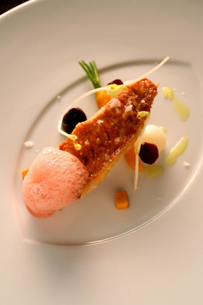 Salmonete ahumado con aire de naranja sanguínea