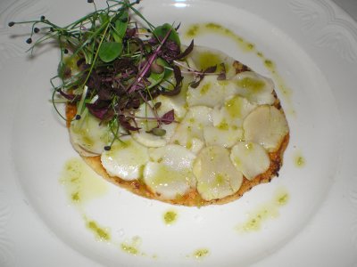27 coca de vieiras con vinagreta de yuzu y sakura