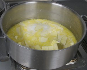 Juntar la leche, la mantequilla y la glucosa en un rondón o sauté y lo ponemos a fuego vivo hasta lograr que hierva.