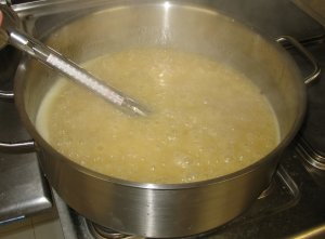Seguiremos dando fuego constante al conjunto, hasta que se recupere la ebullición. Una vez esta sea un hecho mantendremos el calor constante hasta alcanzar 105 ºC. Es muy importante remover constantemente el conjunto ya que se pega con facilidad en el fondo del sauté o rondón.