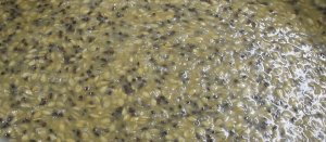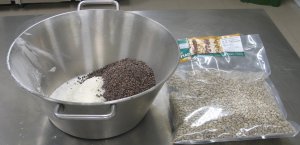 Alcanzados los 105 ºC retiraremos del fuego el conjunto. Agregaremos fuera del fuego el resto de ingtedientes, es decir las pipas peladas, la harina y las habas de cacao.