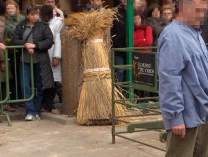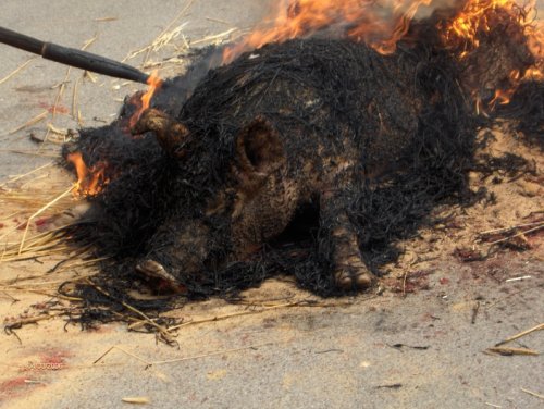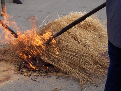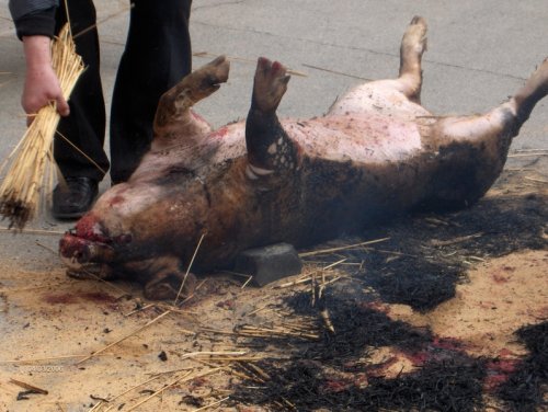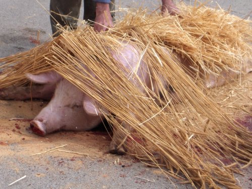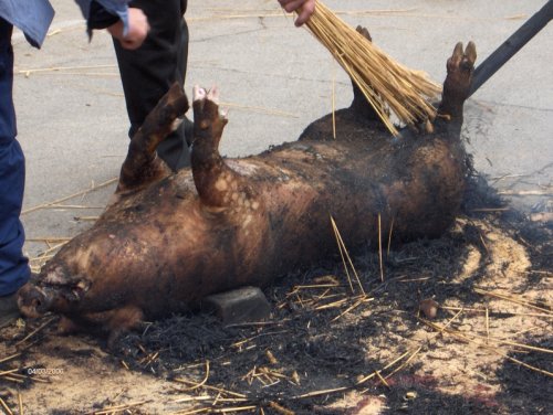 A continuación se le coloca en el suelo, donde se le cubre con paja de centeno que se prende para que el fuego elimine el vello que cubre la piel del cerdo.