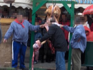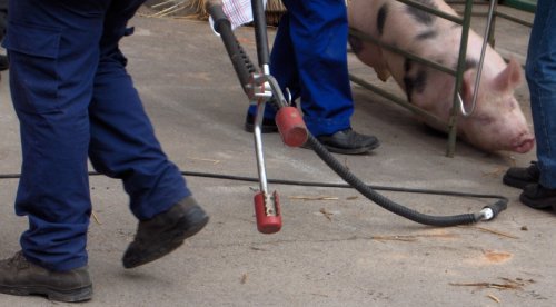 Aquí se utiliza un aparato que libera una descarga eléctrica que deja al animal totalmente insensible, entra en shock y lo mata al instante, de esta forma no siente ningún dolor, ni emite esos sonidos tan penetrantes, y lo hace apto para que lo puedan ver los menores. Se realiza en riguroso cumplimiento de la más estricta normativa sobre el sacrificio de animales.