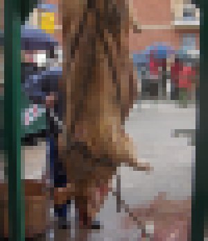 Después se le cuelga boca abajo, se recoge su sangre, se abre en canal y se le eviscera. Las vísceras que se extraen pasan el examen del veterinario. Se deja colgado para que escurra bien la sangre y para que se oree.