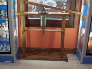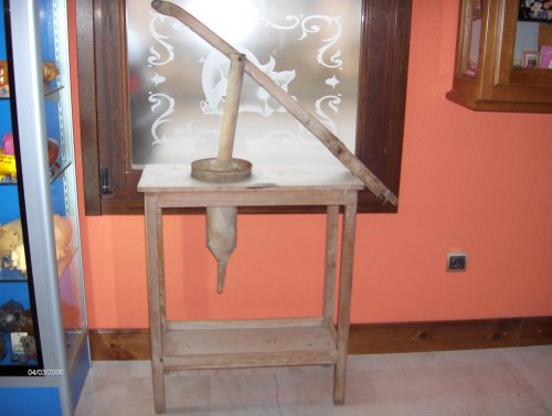 En las fotos siguientes se muestran unos aparatos antiguos, embutidoras artesanales, que se utilizaban para hacer los embutidos. El material utilizado era madera y metal. Construidas sobre un soporte de mesa para facilitar su uso. Funcionan por presión de un brazo de madera con un peso sobre la materia a embutir, en el cilindro metálico. Y en la parte inferior hay un recipiente para recoger el producto elaborado.