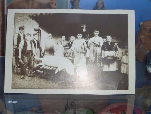 Antigua y entrañable foto en la que se ve a los que hacían la matanza, como veis era un momento importante en las familias, todos, grandes y pequeños, alrededor del cerdo en el momento de comenzar la matanza.