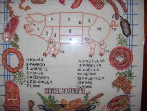 En esta foto un bonito cuadro, por lo menos curioso, de un cerdo hecho a punto de cruz marcando las piezas de que consta y con los nombres de cada una de las piezas, en el que hay un error (¿lo habéis localizado?).