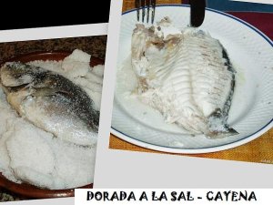 Encima de la "cama" pones la dorada y la cubres de sal gorda totalmente (es muy importante que quede cubierta totalmente) sin poner aceite ni aderezo ninguno.