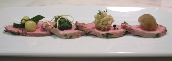 Superponer ligeramente cuatro cortes del solomillo y de izquierda a derecha situar: dos noisettes de calabacín, un poco del resto de la clarificación de las espinacas, una bola de cuscús y un rulo del gelée. Decorar las noisettes con una tira de espinaca fresca, con los hilos de calabacín el resto de la clarificación, unos brotes de tomillo limón encima del cuscús y la reducción del líquido de la bolsa de cocción sobre la gelatina. Calentar en salamandra y salar con Maldon por encima de todo el conjunto antes de servir.