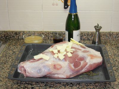 Poner la paleta en una bandeja, repartir por encima la mantequilla en trozos, verter en la bandeja el vasito de Palo Cortao, el tazón de caldo y rociar la paleta con un poco de aceite, y sazonar. Tapar con papel aluminio toda la bandeja y llevar al horno durante 45 minutos a 200º. Pasado ese tiempo, retirar el papel aluminio y seguir cocción durante 45 minutos más, dar la vuelta a la paleta, rociar la paleta de vez en cuando con los jugos que hay en la bandeja, y añadir el resto de cava poco a poco, seguir cocción durante 45 minutos más, volver a dar la vuelta y bajar el fuego a 180º rociar de nuevo con los jugos, y dejar otros 30 minutos.