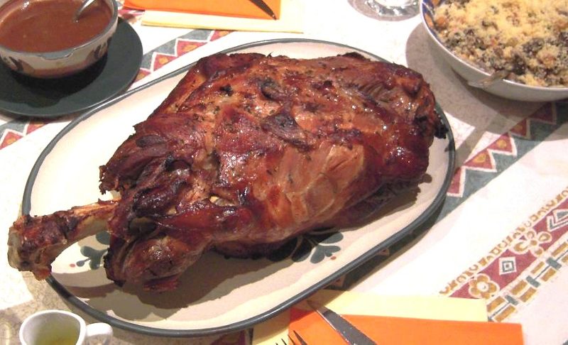 Servir la carne, acompañada de la guarnición y la salsa de los jugos que quede en la bandeja.