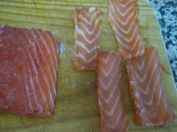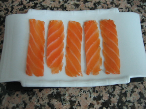 Cortaremos el salmón en lonchas finas, gruesas, en taquitos, como más nos guste o como queramos presentarlo en el plato, se puede poner solo o acompañado, siempre estará delicioso.