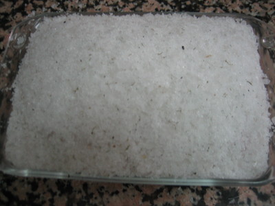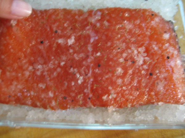 En un recipiente que sea un poco más grande que la pieza, cubrimos el fondo, colocamos el salmón encima con la piel hacia abajo, y volvemos a echar la mezcla de sal y azúcar hasta cubrirlo por completo.