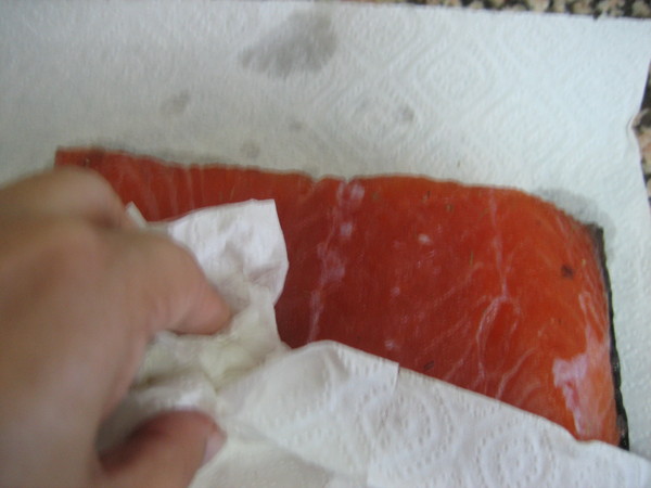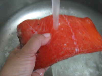 En la pescadería le pediremos al pescadero que nos lo limpie de espinas, y deje los lomos bien limpios pero con su piel. Lavamos el salmón y lo secamos bien. Reservamos.