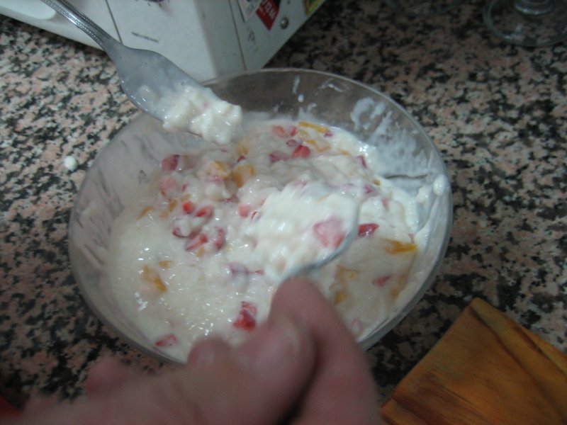 Lavamos y troceamos pequeño las fresas. Troceamos de igual tamaño el melocotón en almíbar que ha de estar bien escurrido. Mezclamos ambas frutas con el arroz.