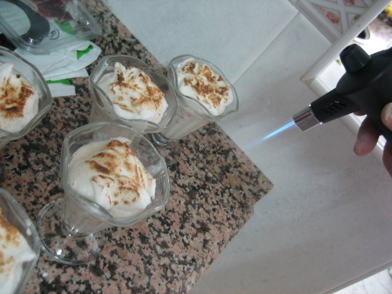 Ponemos en cada copa la mezcla de arroz y fruta. Encima le ponemos la clara montada, justo para cubrir. Espolvoreamos con azúcar glass por encima y quemamos la superficie con el soplete.