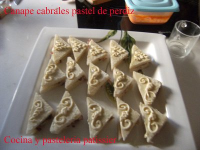 Poner sobre una de las rebanadas de pan una fina capa de esta crema poner otra rebanada encima de la primera, untar una fina capa de crema de cabrales y decorar con mahonesa.
