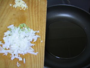 Picamos la cebolleta y el ajo y lo ponemos en la sartén a que se poche con el aceite.