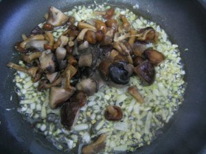 Añadimos las setas troceadas y las removemos uno o dos minutos con la cebolla y el ajo picados.