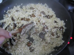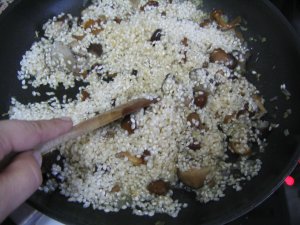 Añadimos el arroz y sazonamos. Y rehogamos muy bien, hasta que el grano quede transparente.