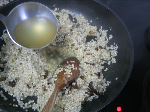El caldo de verduras lo tendremos en el fuego para que permanezca caliente durante todo el proceso. Vamos añadiendo el caldo poco a poco.