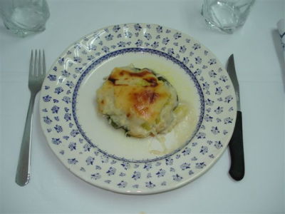 Mientas tanto ablandar los cascos delos calabacines, al vapor. No salar para que no pierdan jugo. Yo lo hice en olla rápida, a media presión, en 2 minutos y sacando el vapor antes de que se enfriase.Simultáneamente se puede ir haciendo una bechamel clara . Salar y colocar los cascos ablandados en una fuente de horno.