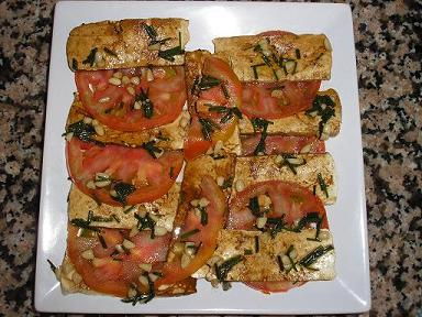Mientras colocar los tomates en el congelador 8 min. para que se endurezcan un poco. Pasado ese tiempo, y con la ayuda de un cuchillo muy afilado cortarlas en rodajas muy finas. Montar el plato alternando láminas de tomate con otras de tofu previamente escurrido de la vinagreta. Terminar regando el plato con la vinagreta sobrante de la maceración.